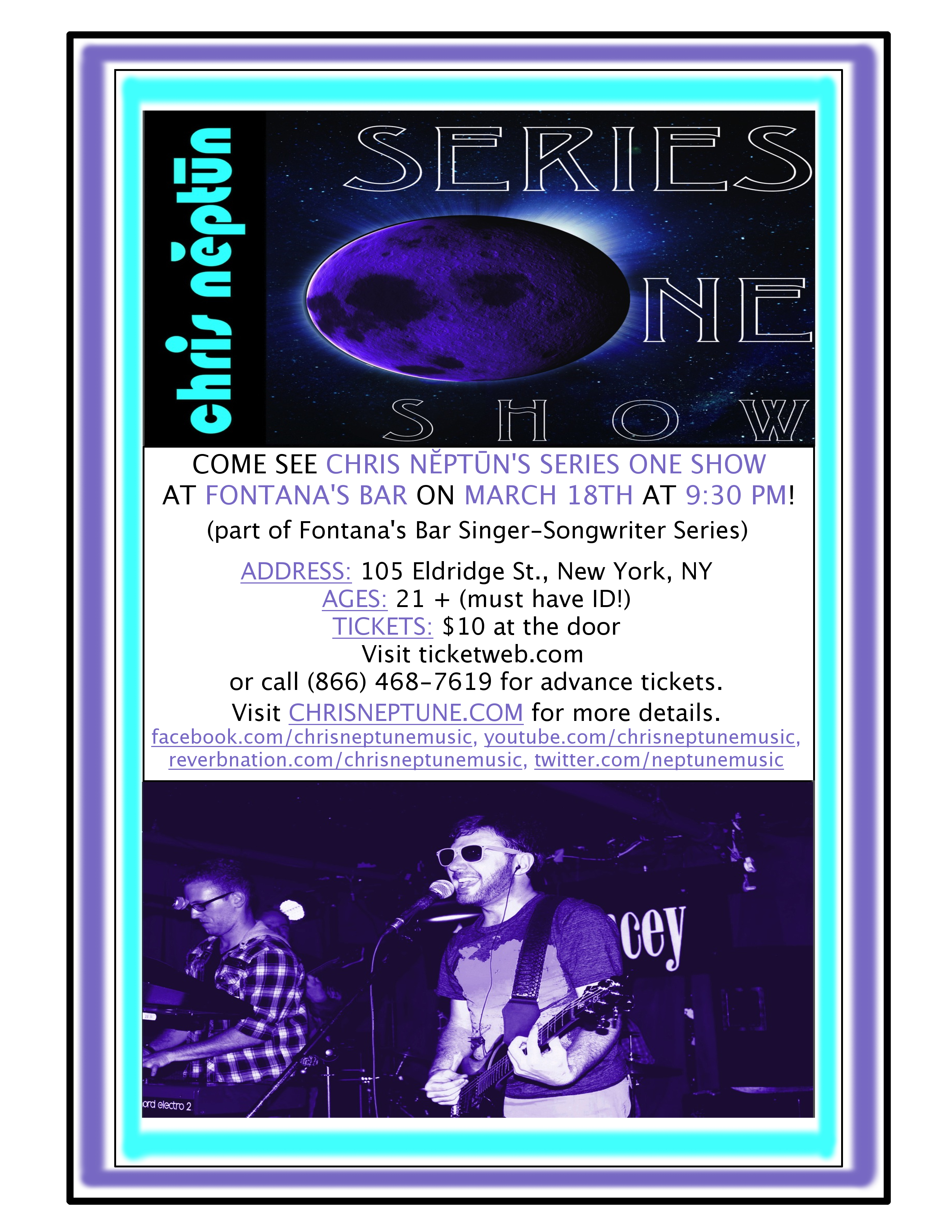 Come celebrate the past, the present, and the future with Chris Neptune at his one and only Series One Show, presented by CEG! It will be at 9:30 PM on Wednesday, March 18th, 2015, at Fontana’s Bar in NYC. This is an open event, so invite your friends! There will also be performances by Liz Turner, Jasmine Marie, The Lighthearted, and Meg Berry! Here’s the link to the official Facebook event (be sure to click and RSVP!): https://www.facebook.com/events/769201486489442/